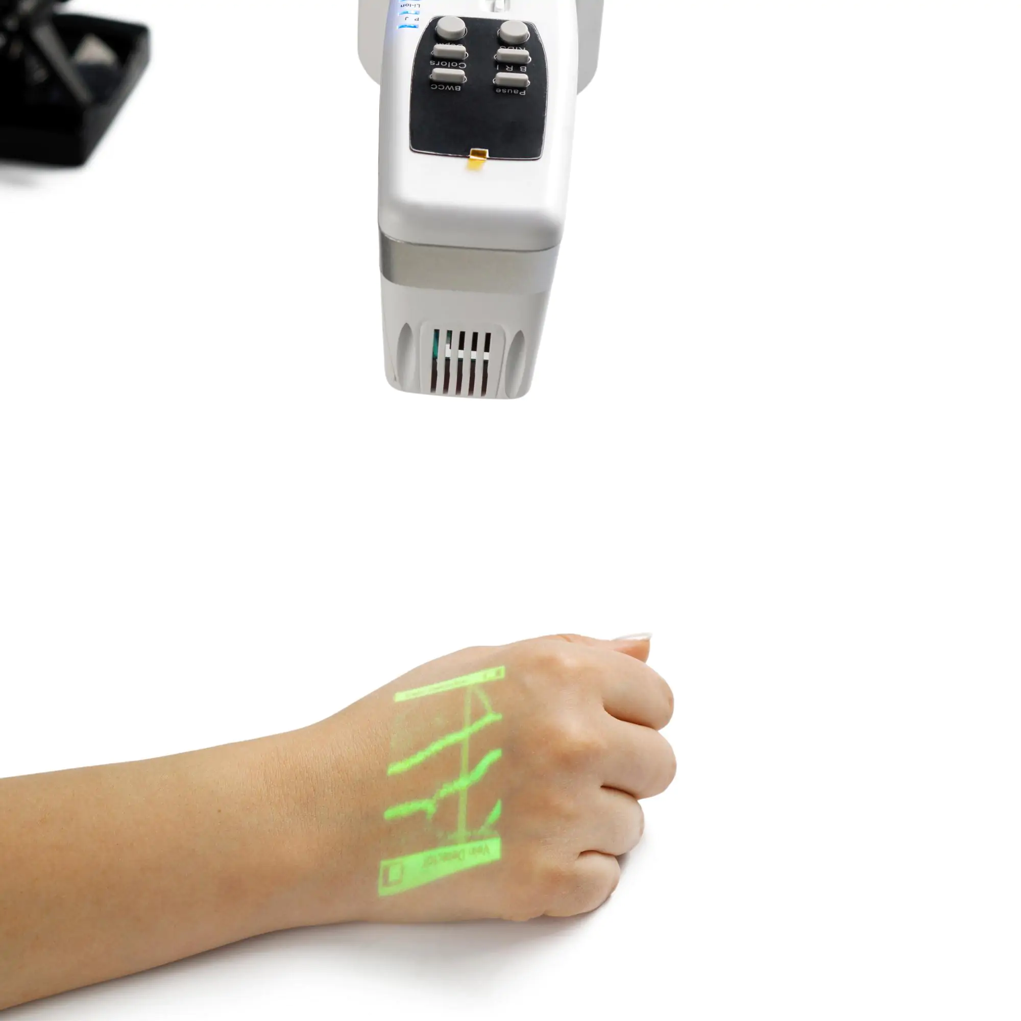 - Особенности: работа от сети и аккумулятора, настройка яркости (3 уровня), проекция вен на кожу, три цветовых режима (белый, зеленый, красный), индикация глубины вен, регулировка размера изображения (для младенцев, детей и взрослых).